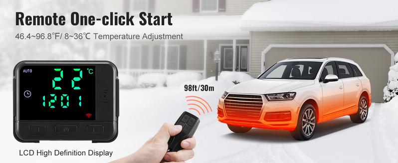 - Two Control Methods: Equipped with a 98ft/30m long-distance remote control, you can easily start the diesel heater with a single click in advance. The temperature can be freely adjusted from 46.4~96.8℉/8~36℃, eliminating cold inside the vehicle, frost outside the vehicle, and fogging of windows, allowing you to feel warmth as soon as you enter the vehicle. The high-definition display screen also allows easy control, enabling you to understand the machine's status effortlessly.