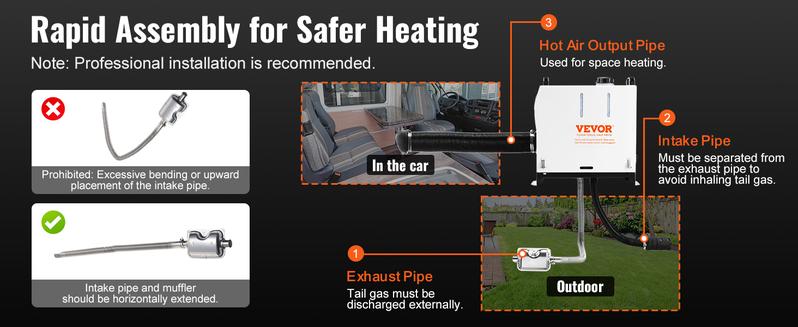 For enhanced secure, it is recommended that professionals handle the assembly. Note: ① Ensure unobstructed airflow for the intake; ② Exhaust pipes should be positioned outdoors, with emissions expelled away from flammable materials.