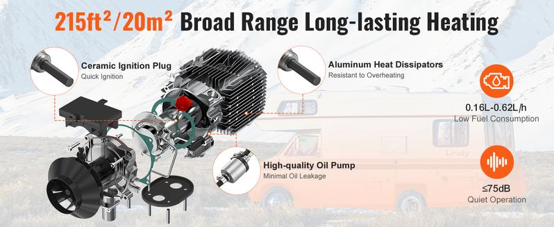- Low Fuel Consumption: Our diesel heater has a power range of 5-8kw with a heating efficiency of ≥90%. It consumes only 1 GAL of diesel per night to keep a large area of 215ft²/20㎡ continuously warm. It features built-in intelligent thermostat control and high-quality muffler for low noise ≤75dB, ensuring a comfortable sleep in RVs and outdoor camping without being disturbed by the cold.